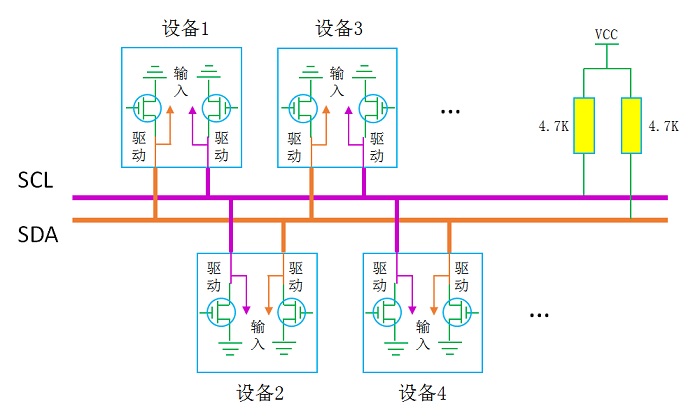 I2C接口对总线的高、低电平的驱动是有区别的。对低电平的驱动是强驱动,用MOS管来驱动;对高电平的驱动是弱驱动,用上拉电阻来驱动。于是,所有挂在I2C总线上的接口形成了"线与"的关系。这样,就从电路属性上保证了各个接口可以同时对总线加以驱动,而不用担心高、低电平之间发生短路的问题。总线上实际表现出的逻辑值,是所有接口输出的逻辑值的"与"运算。 |