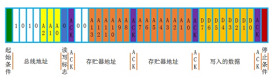 起始条件之后,第1个字节是I2C总线地址和传输方向控制位。控制位RW为0表示随后的数据是从单片机传送给AT24CXX的。再后面的两个字节是AT24CXX的存贮单元地址,告诉AT24CXX随后的数据存贮在哪里。最后一个字节是写入的数据。每当1个字节的数据传送完,AT24CXX送出1个ACK应答。全部数据传送完成之后,单片机发送1个停止条件,结束本次通信。 |