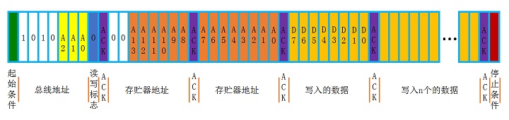 单片机向AT24CXX写入数据的总线数据流如图(6)所示。 |