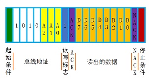 从AT24CXX中读回1个字节的数据的总线数据流如图(8)所示。所读回的数据的是当前AT24CXX内部地址寄存器所指向的存贮器单元的内容,读出后地址寄存器自动加1。 |