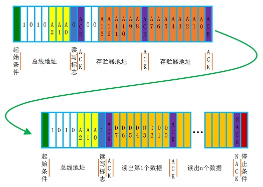 当然,也可以一次读出多个数据。每读出一个字节的数据,AT24CXX内部的存贮单元地址寄存器会自动加1。这样,下一个读出的数据就是下一个地址单元的内容。与写入不同的是,在读出数据时,存贮单元地址寄存器的值会跨跃页的边缘,一直增大到整个存贮器的最高地址,然后回到0地址。所以,在读出操作时,可以一次读出多于64个字节的数据。 |